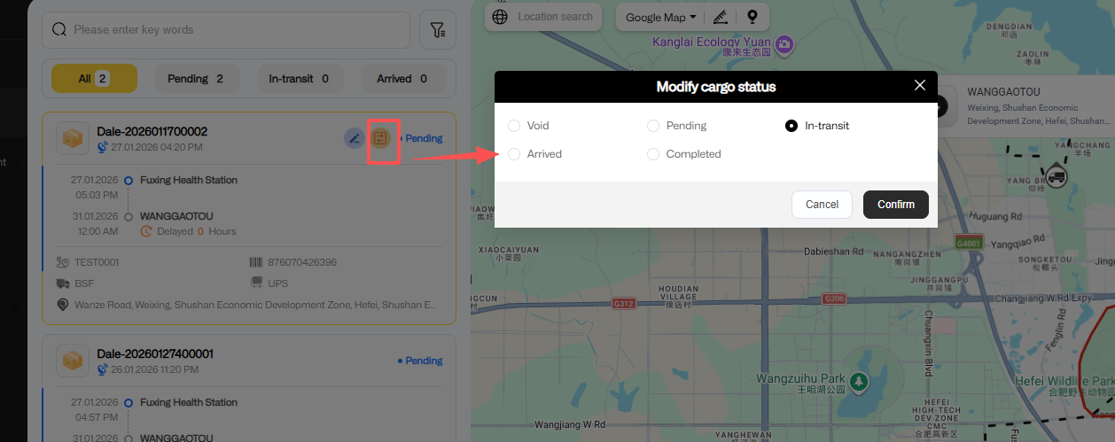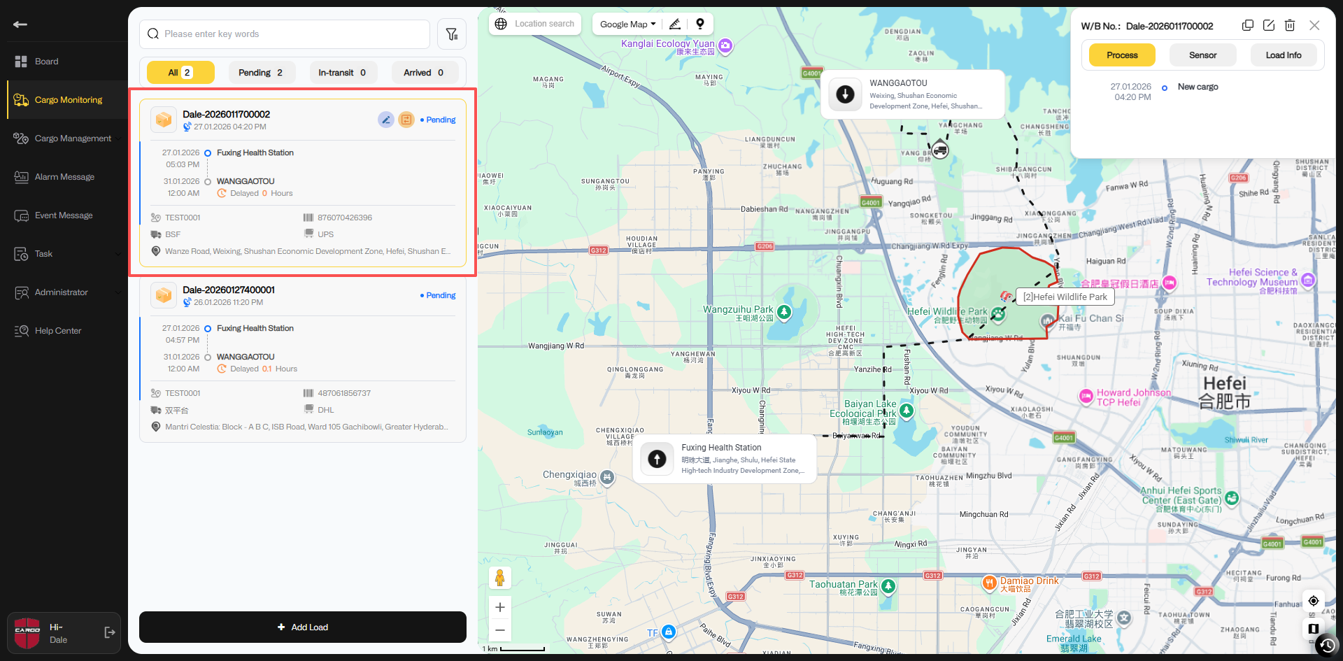 Select a task panel to view the traveled route of the current vehicle, its real-time location, transportation progress, sensor data and cargo details.